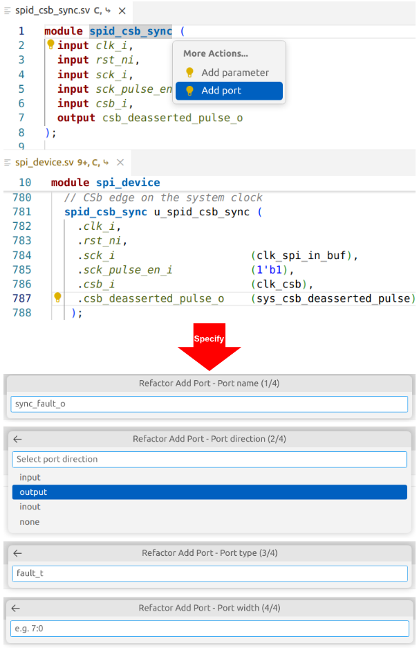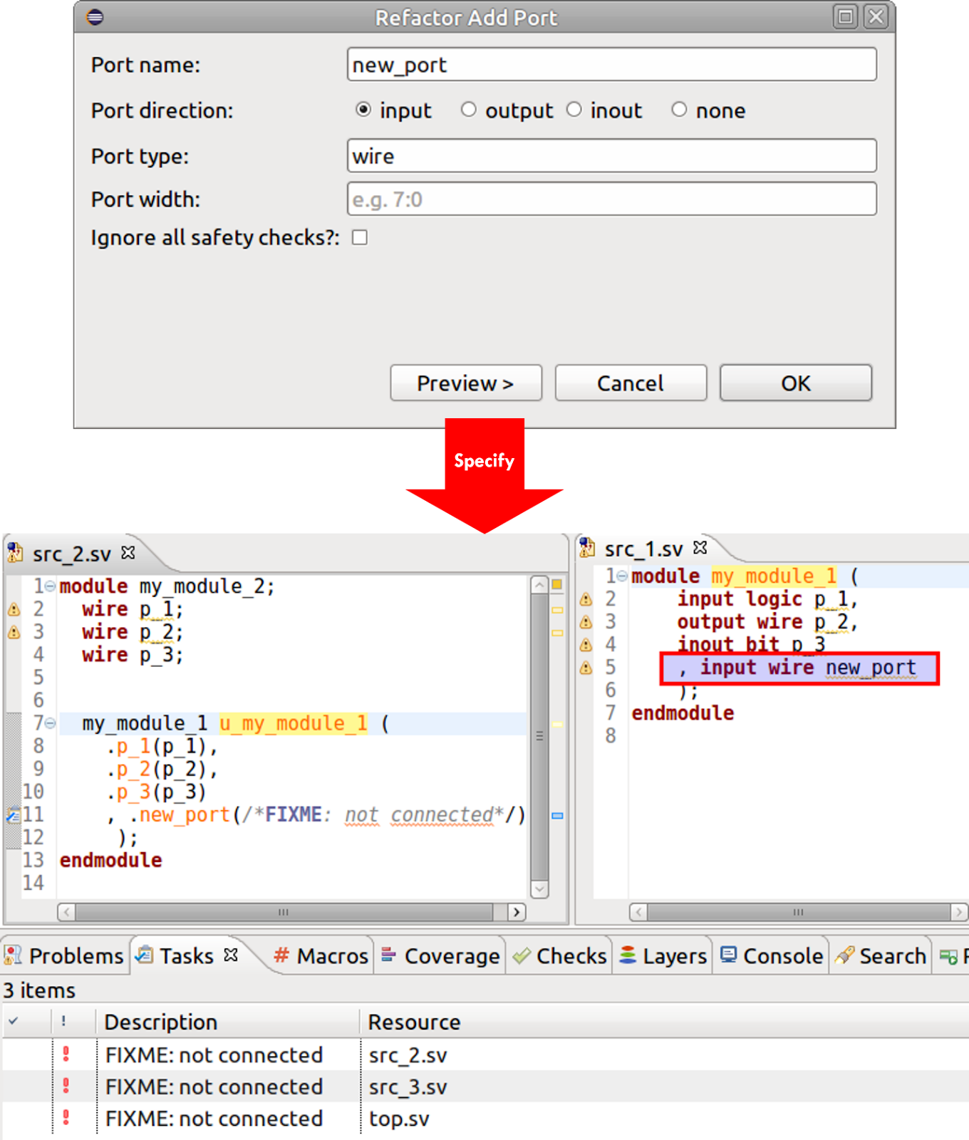 Another example demonstrates the ability of the IDE to safely reorganize parts of the design to aid in the refactoring process. You can easily add new ports to an existing module (Figure 8), with control over port name, direction, and width. The IDE adds the port to the module definition and adds an empty port connection to all instances of the module, along with a // FIXME comment to remind you to connect the new port.