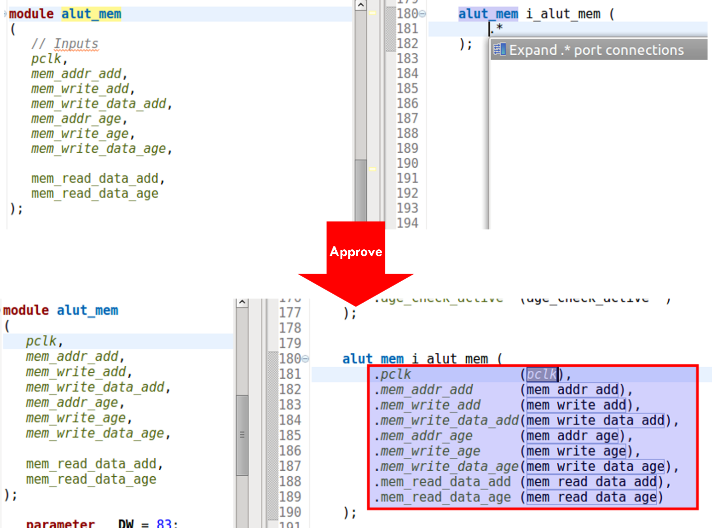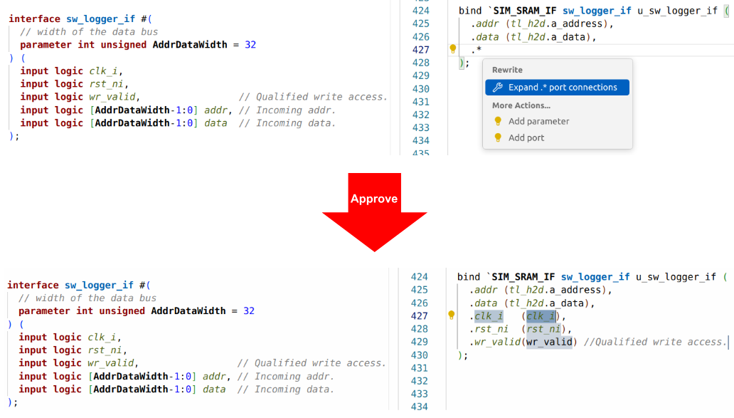 For example, Verilog and SystemVerilog let you specify module instance port connections and function call arguments by position or by name. The positional syntax is more concise, but can be confusing without explicit connections. The named syntax improves readability and it is not sensitive to argument or ports order, but it requires more typing. You might prefer to pick one style and stick with it, but conformance to your project coding guidelines may require conversion. Figure 5 shows the IDE automatically converting between the two styles.