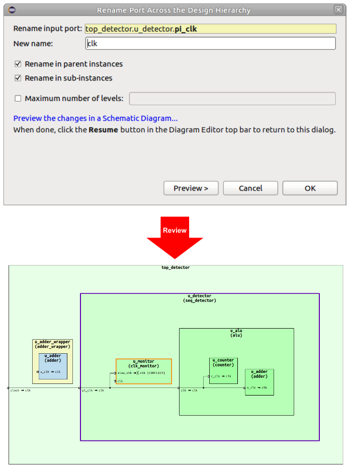One type of refactoring that is particularly hard to do by hand is uniformly renaming a port directly propagated across several levels of the design. As shown in Figure 2, the IDE provides an automated rename across the design hierarchy.