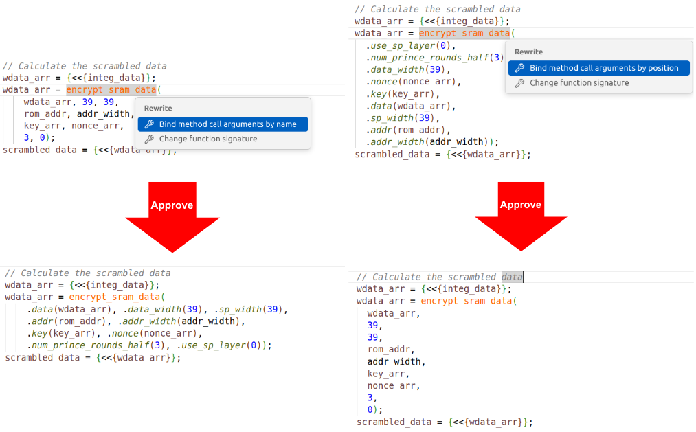 Being able to switch to named arguments with one click is very useful when reviewing or debugging code, since the connections are visible and you can easily see errors by inspection. A similar refactoring involves the SystemVerilog .*