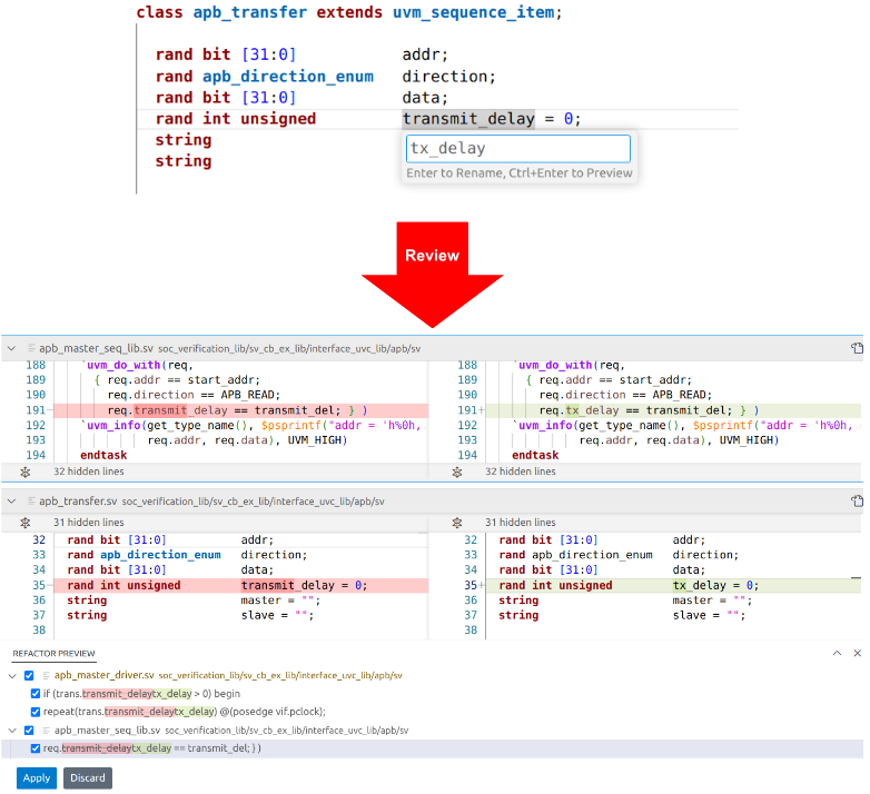 Many element names are similar, making it almost impossible to specify a search expression that will change only the names you want without side effects. And the names can even be identical in separate submodules, so if you’re editing multiple parts of the design at once, confusion is likely. Plus, if a similar change is being made to multiple files, you’d have to edit each, in turn, which gets tedious as well as error-prone. So, this popular form of refactoring must be done very carefully to ensure safety and consistency at scale.