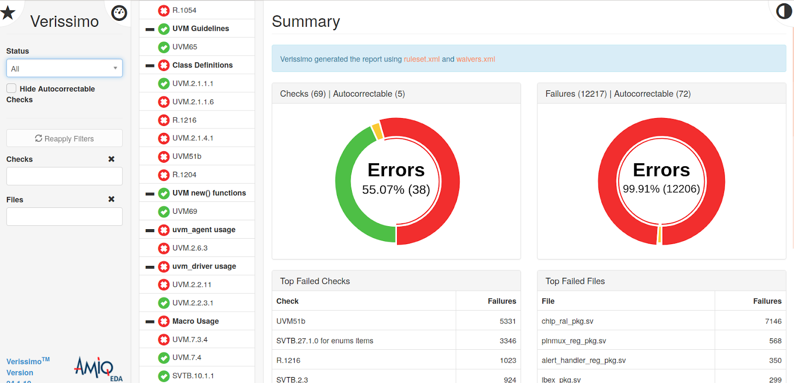 Additionally, the flexibility of these tools allows for highly customizable linting rules, which teams can refine to match the specific requirements of their RISC-V projects. Collaborations with groups such as OpenHW Foundation have shown that integrating these tools into a CI flow not only uncovers code quality issues—such as problematic overrides or usage of unsupported constructs—but also provides an openly accessible dashboard of linting results. This transparency fosters a collaborative approach to maintaining coding standards within an open-source ecosystem. A tuned Verissimo lint rule set is available to all OpenHW users and continuously executed every few hours on AMIQ’s servers.